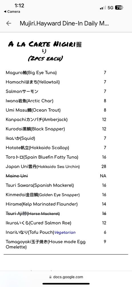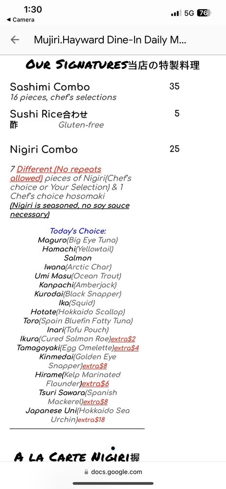 Different (No repeats allowed) pieces of Nigiri (Chef’s choice or Your Selection) & Chef’s choice Hosomaki (Nigiri is seasoned, no soy sauce necessary) Fish will be substituted by chef if it's not available. Fish menu changes everyday. Thank you.